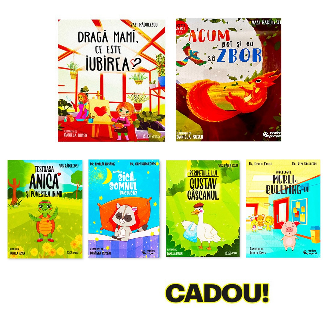 În acest pachet limitat ai 6 cărți ilustrate, destinate copiilor dornici să cunoască lucruri despre iubire, curiozitate, perseverență, prietenie.