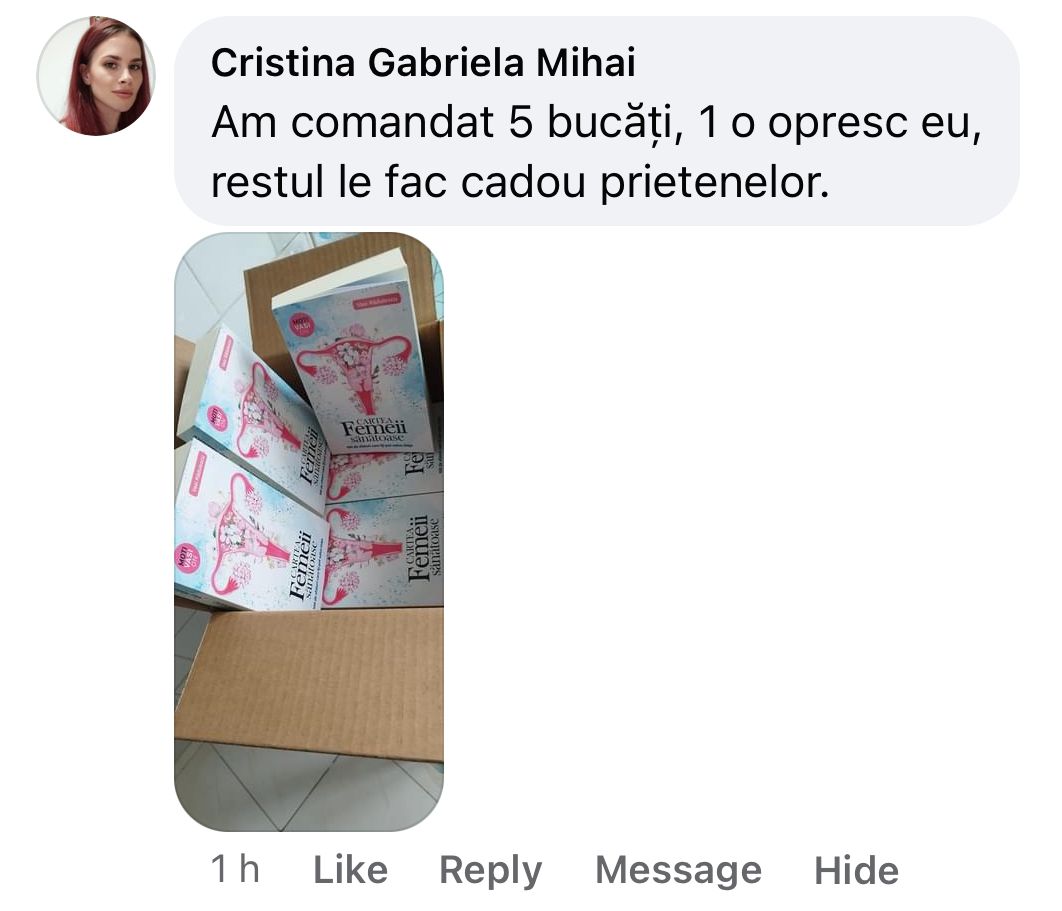 Cartea e gândită și scrisă special ca să fie accesibilă tuturor, cu explicații, cazuri, povești, statistici cât mai blând așezate în pagini. O cititoare a spus că e ca o biblie de sănătate pentru orice femeie, așadar ar fi bine să se găsească în orice familie. Nu pot decât să fiu de acord.