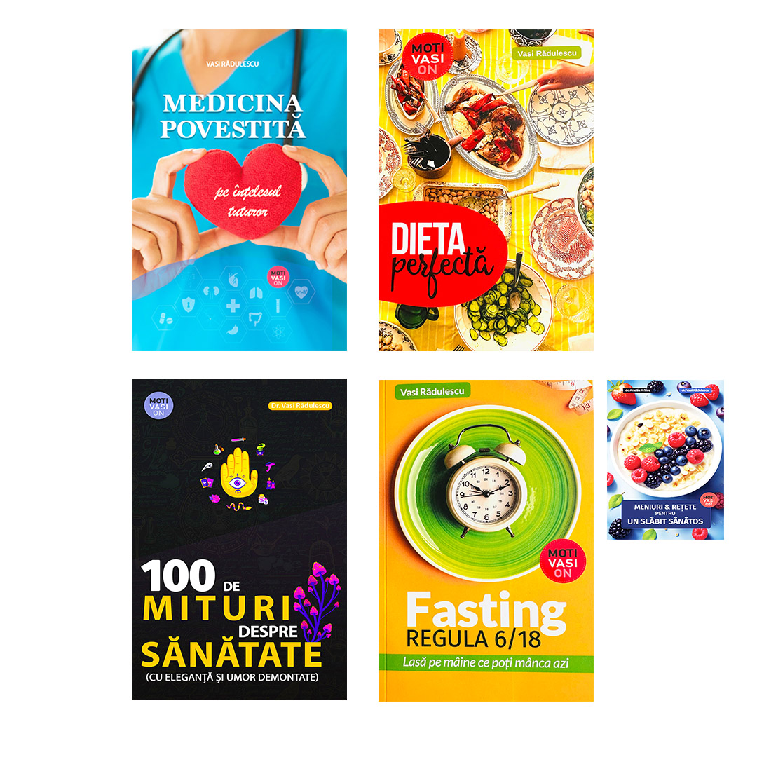 Am ajutat prin consultații peste 10.000 de oameni, cu rezultate extraordinare. Toate sfaturile au fost strânse și oferite acum în aceste cărți care îți explică, pas cu pas, tot ce trebuie să faci pentru a ajunge la o greutate normală, a adopta cele mai bune obiceiuri, a implementa cele mai eficiente sfaturi. Pornind de la creier, corp, sistemele nervoase, hormonale, optimizăm tot. – dr. Vasi Rădulescu