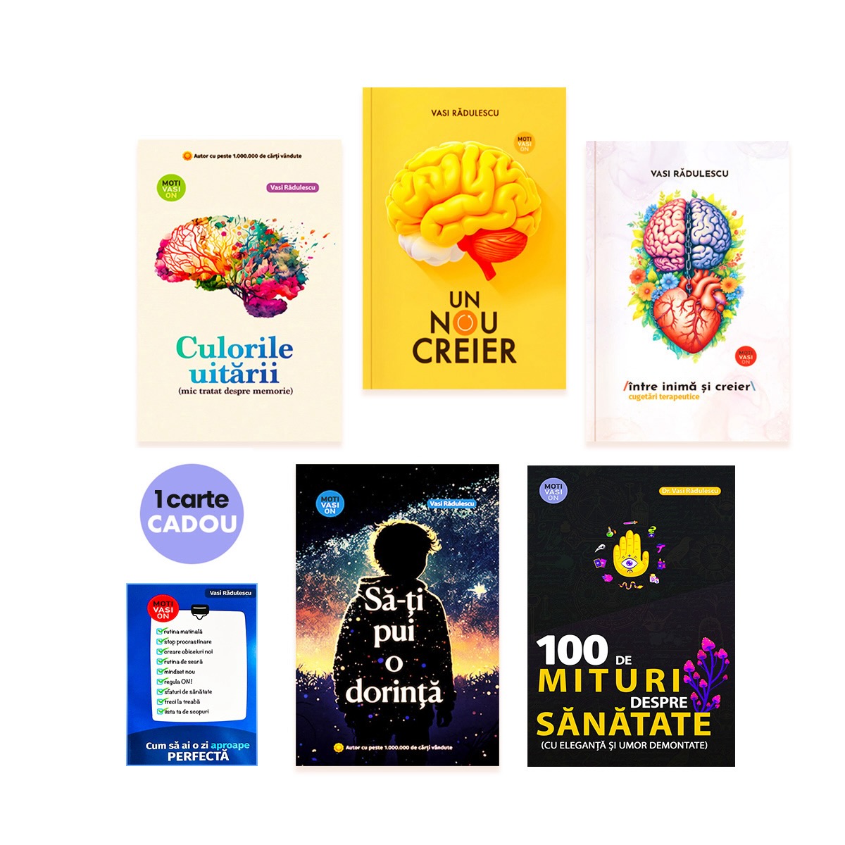 Am ales aceste cărți pornind de la minunata Un nou creier, carte care te ajută să îți înțelegi altfel organul suprem, reușind să dezlegi potențialul său și să vezi total diferit întreaga viață. În pachet mai găsești cartea cu miturile – te ajută să te informezi corect și să te ferești de sfaturile care nu au fundament științific. Cartea despre longevitate este o lectură fascinantă. Cea despre fasting îți arată efectele extraordinare asupra creierului, iar manifestul Dă-ți 5 ani te învață cum să îți schimbi viața. dr. Vasi Rădulescu